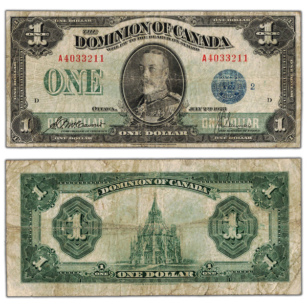 Available for sale is a $1 1923 Dominion of Canada Note Blue Seal Series A DC-25h - Fine