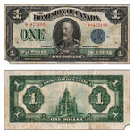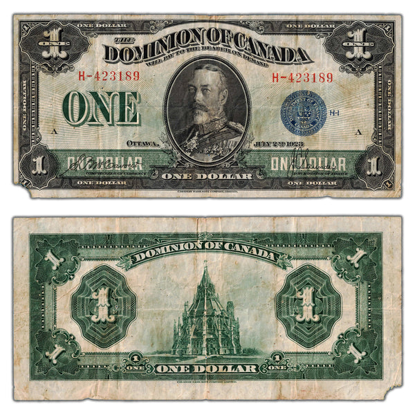 Available for sale is a $1 1923 Dominion of Canada Note Blue Seal Series H DC-25c - Missing Corner/Pinholes