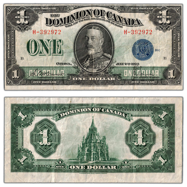 Available for sale is a $1 1923 Dominion of Canada Note Blue Seal Series H DC-25c - VF