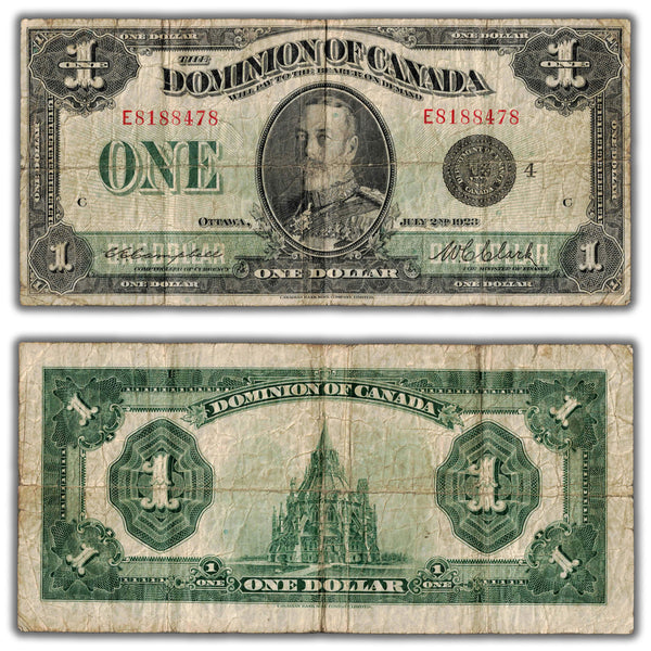 Available for sale is a $1 1923 Dominion of Canada Note Black Seal Series E DC-25o - Fine