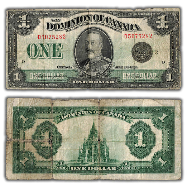 Available for sale is a $1 1923 Dominion of Canada Note Campbell-Saunders Black Seal DC-25n - Holes