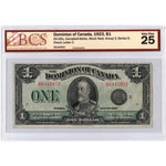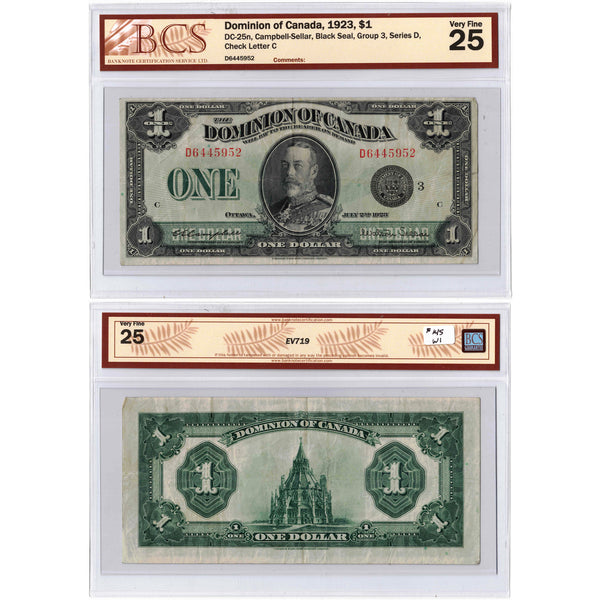 Available for sale is a $1 1923 Dominion of Canada Note Campbell-Sellar Black Seal DC-25n - BCS VF-25
