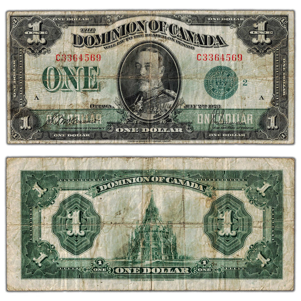 Available for sale is a $1 1923 Dominion of Canada Note Green Seal Series C DC-25j - Soiling
