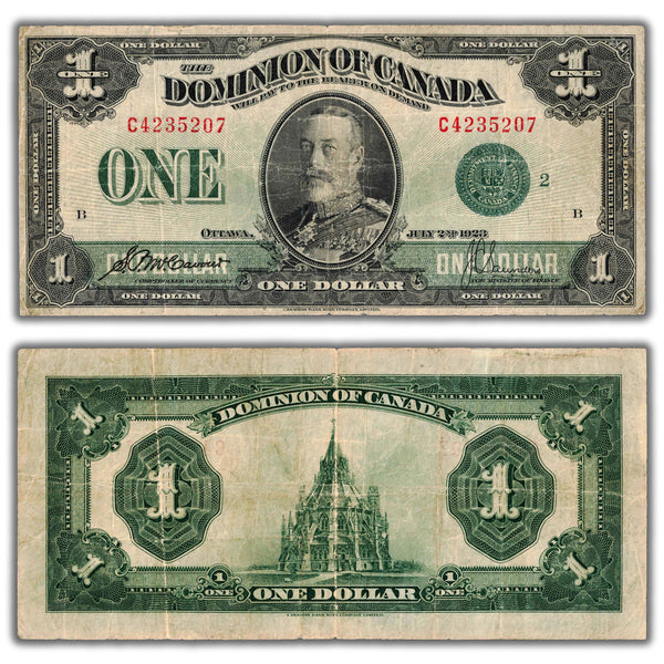 Available for sale is a $1 1923 Dominion of Canada Note Green Seal Series C DC-25j - Fine+