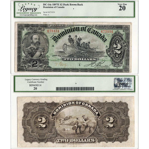 Available for sale is a $2 1897 Dominion of Canada Note Boville Dark Brown Back DC-14c - Legacy VF-20