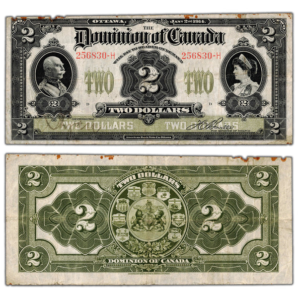 Available for sale is a $2 1914 Dominion of Canada Note No Seal Series H DC-22a-i - VF (rust/missing small bits)