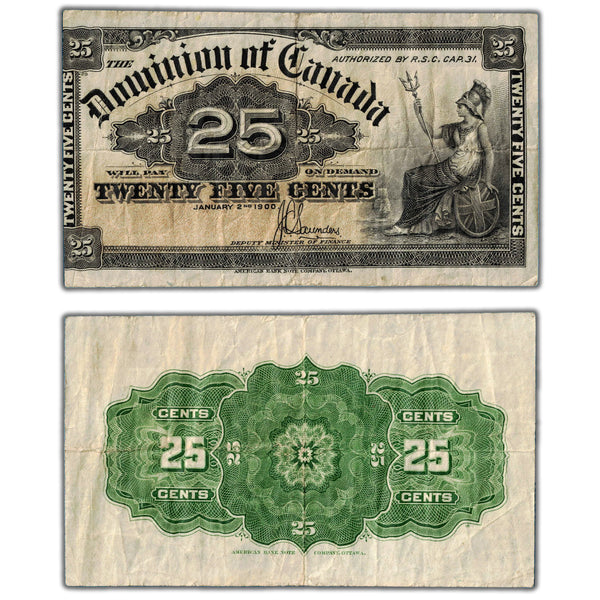 Available for sale is a 25 Cents 1900 Dominion of Canada Shinplaster Note Saunders DC-15c - F/VF