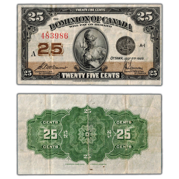 Available for sale is a 25 Cents 1923 Dominion of Canada Note Shinplaster DC-24c - VF