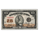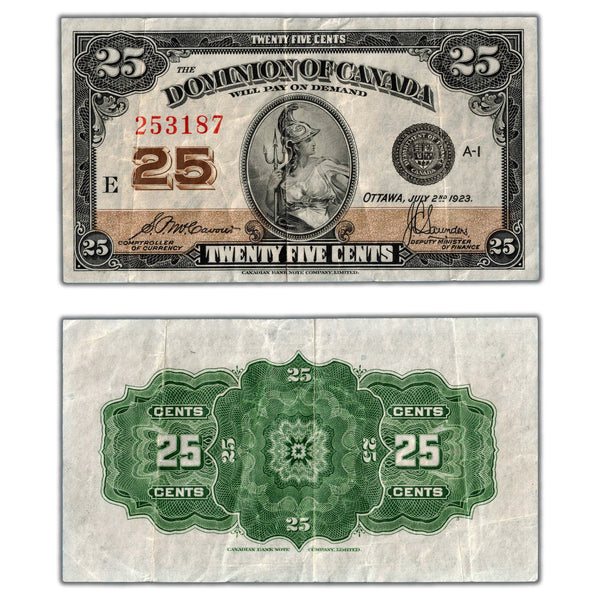 Available for sale is a 25 Cents 1923 Dominion of Canada Note Shinplaster DC-24c - VF+