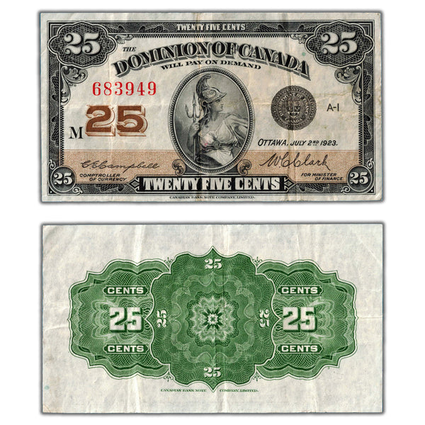 Available for sale is a 25 Cents 1923 Dominion of Canada Note Shinplaster DC-24d - VF SKU: 683949