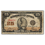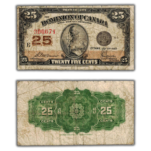 Available for sale is a 25 Cents 1923 Dominion of Canada Shinplaster Note DC-24c