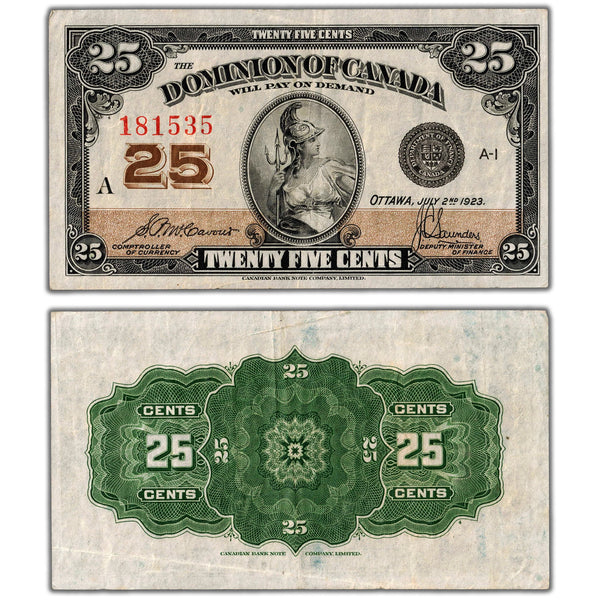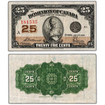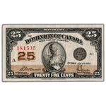 Available for sale is a 25 Cents 1923 Dominion of Canada Shinplaster Note DC-24c - VF+