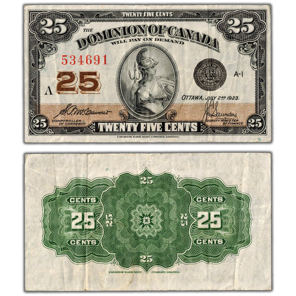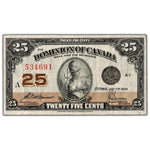 Available for sale is a 25 Cents 1923 Dominion of Canada Shinplaster Note DC-24c - VF