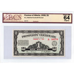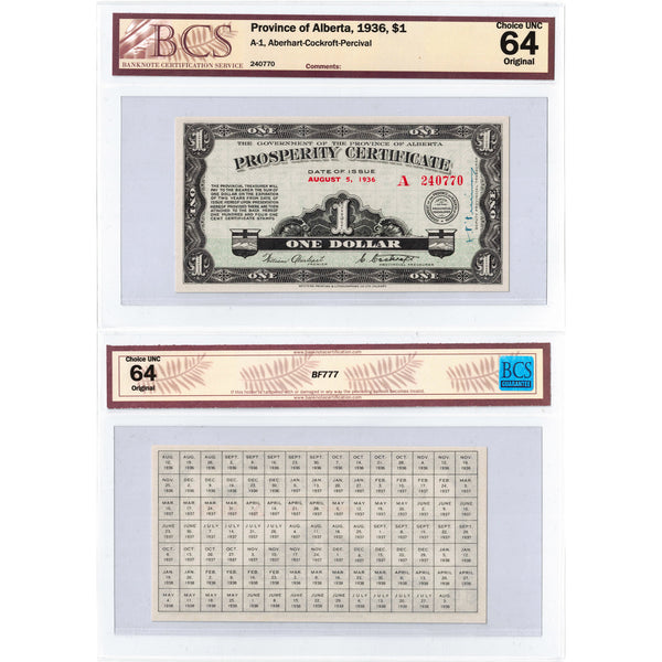 Available for sale is a $1 1936 Province of Alberta Prosperity Certificate Note No Stamps A-1 - BCS Ch UNC-64