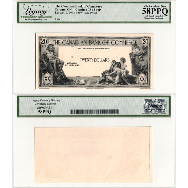 Available for sale is a $20 1935 Canadian Bank of Commerce Front Proof Note #75-18-10P - Legacy AU-58 PPQ