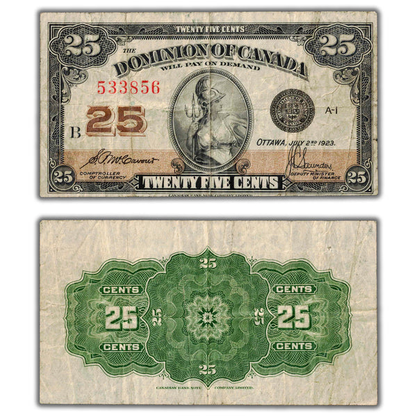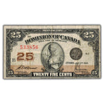Available for sale is a 25 Cents 1923 Dominion of Canada Shinplaster Note DC-24c - Fine