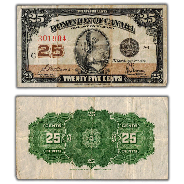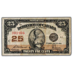 Available for sale is a 25 Cents 1923 Dominion of Canada Shinplaster Note DC-24c - F/VF