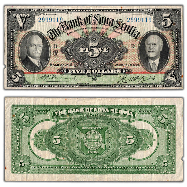 Available for sale is a $5 1929 Bank of Nova Scotia Chartered Note Type 1 McLeod CH #550-34-02