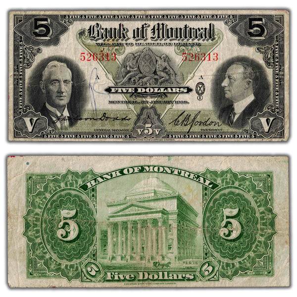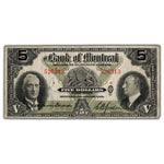Available for sale is a $5 1938 Bank of Montreal Canada Chartered Note CH #505-62-02 - Writing