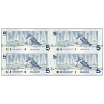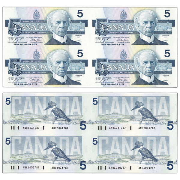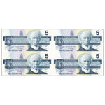Available for sale is a $5 1986 Bank of Canada Notes Uncut Block of 4 - Uncirculated