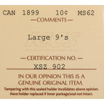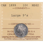 Available for sale is a Canada 1899 Large 9's 10 Cents Dime Silver Coin - ICCS MS-62