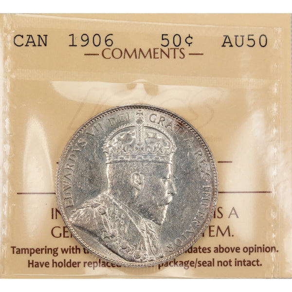Available for sale is a Canada 1906 50 Cents Half Dollar Silver Coin - ICCS AU-50 Country: Canada Year: 1906 Denomination: Fifty Cents  Quantity Minted: 350,000 Composition: Silver (.925) Comments:...