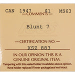 Available for sale is a Canada 1947 Blunt 7 $1 Silver Dollar Coin - ICCS MS-63