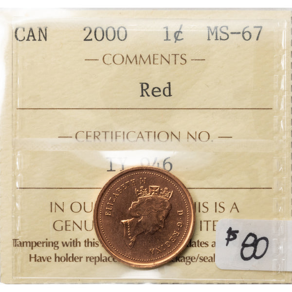 Available for sale is a Canada 2000 1 Small Cent Coin - ICCS MS-67 Red