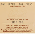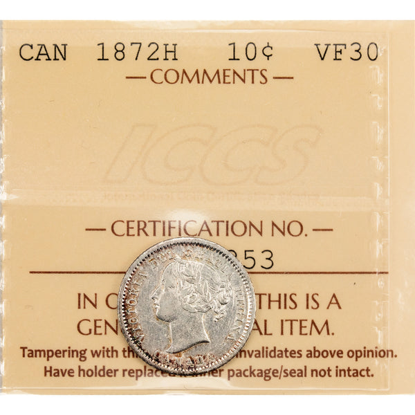 Available for sale is a Canada 1872-H 10 Cents Dime Silver Coin - ICCS VF-30