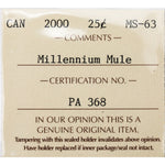 Available for sale is a Canada Error 2000 Millennium Mule 25 Cents Quarter Coin - ICCS MS-63 SKU: PA 368