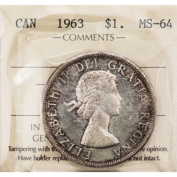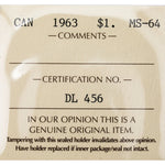 Available for sale is a Canada 1963 $1 Silver Dollar Coin - ICCS MS-64