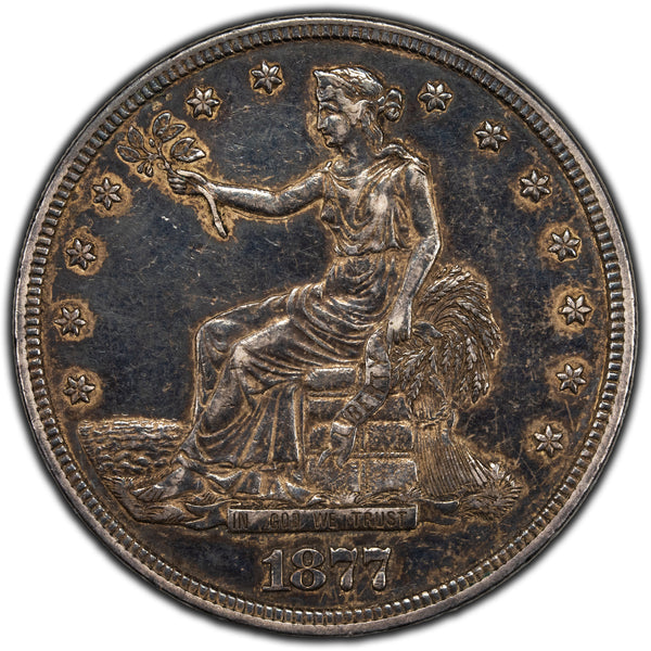 Available for sale is a United States 1877 $1 Trade Dollar Silver Coin - Old Cleaning