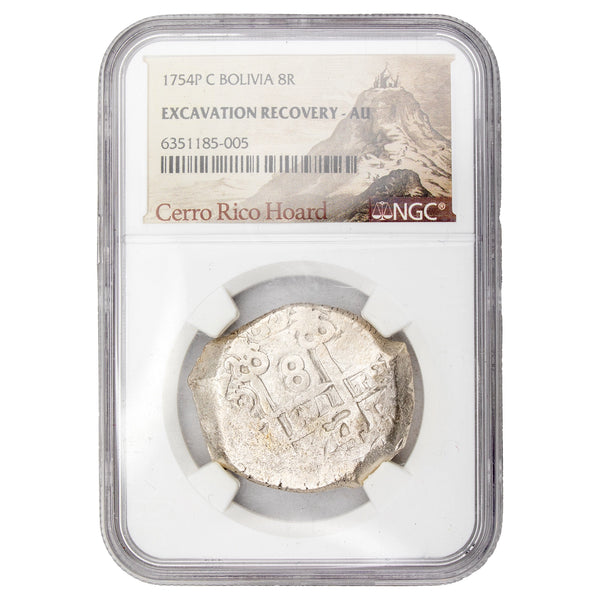 Available for sale is a Bolivia 1754 P C 8 Reales Cob Silver Coin - NGC AU - Cerro Rico Hoard