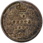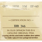 Available for sale is a Canada 1858 10 Cents Dime Silver Coin - ICCS EF-40