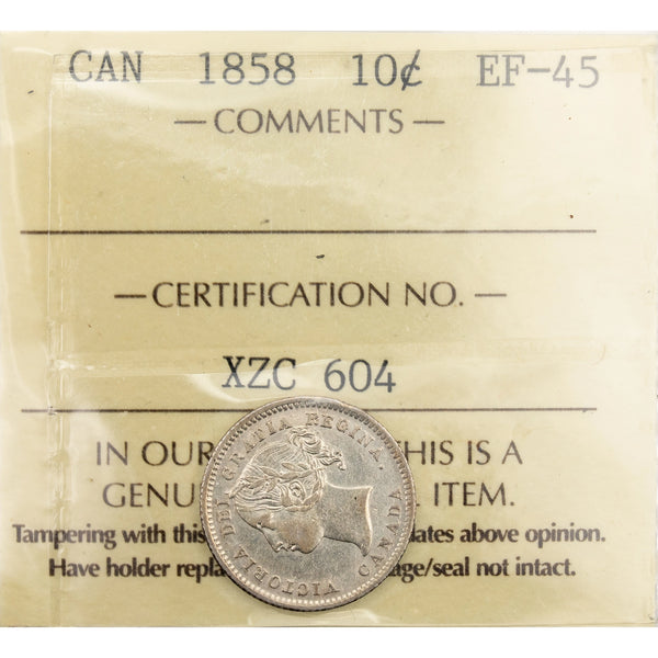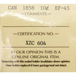 Available for sale is a Canada 1858 10 Cents Dime Silver Coin - ICCS EF-45