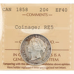 Available for sale is a Canada 1858 20 Cents Silver Coin One Year Type! - ICCS EF-40 Country: Canada Year: 1858 Denomination: Twenty Cents Quantity Minted: 730,392 Composition: Silver (.925)...