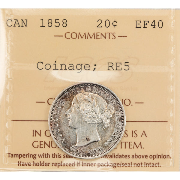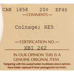 Available for sale is a Canada 1858 20 Cents Silver Coin One Year Type! - ICCS EF-40