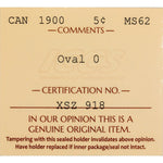 Available for sale is a Canada 1900 Oval O 5 Cents Silver Coin - ICCS MS-62