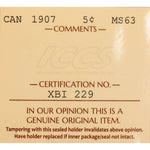 Available for sale is a Canada 1907 5 Cents Silver Coin - ICCS MS-63