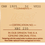 Available for sale is a Canada 1925 5 Cents Nickel Coin Key Date! - ICCS VF-20
