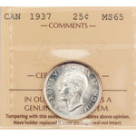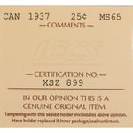 Available for sale is a Canada 1937 25 Cents Quarter Silver Coin - ICCS MS-65