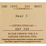 Available for sale is a Canada 1943 Near 3 50 Cents Half Dollar Silver Coin - MS-63
