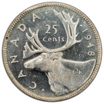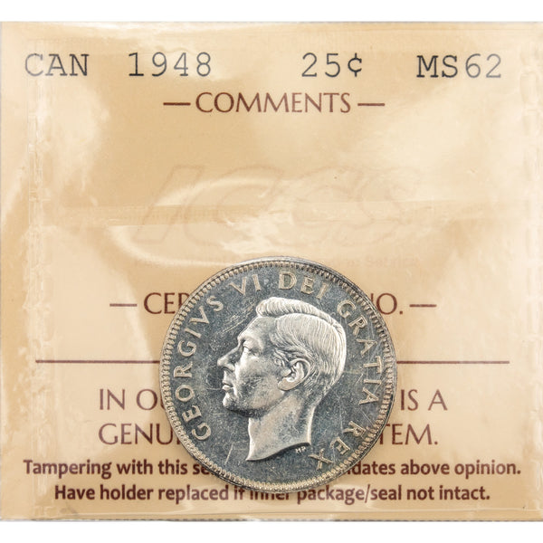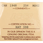 Available for sale is a Canada 1948 25 Cents Quarter Silver Coin - ICCS MS-62