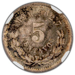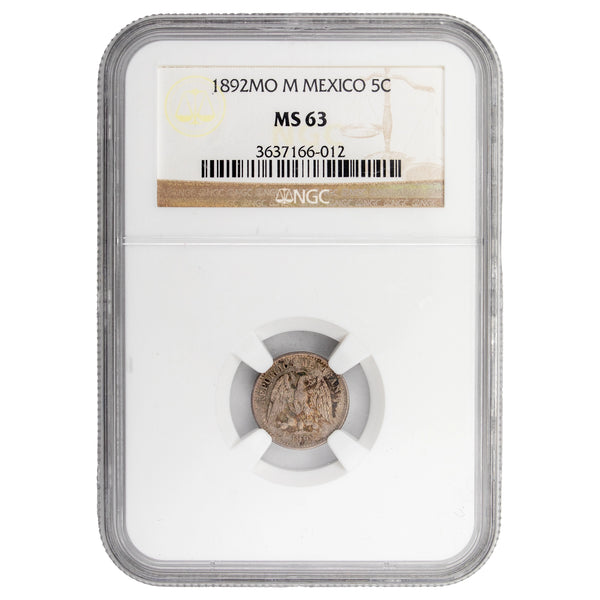 Available for sale is a Mexico 1892 MO M 5 Centavos Silver Coin - NGC MS-63
