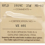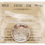 Available for sale is a Newfoundland 1919-C 25 Cents Quarter Silver Coin - ICCS MS-62