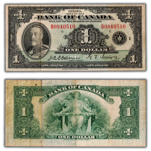 Available for sale is a $1 1935 Bank of Canada Note English Text Series B BC-1 - VF (stained)