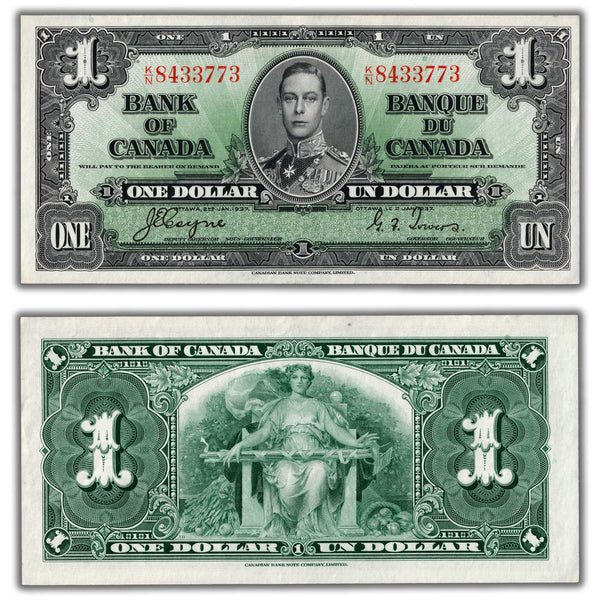Available for sale is a $1 1937 Bank of Canada Note Coyne-Towers K/N Prefix BC-21d - AU+
