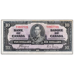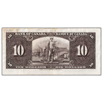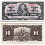 Available for sale is a $10 1937 Bank of Canada Note Coyne-Towers H/T Prefix BC-24c - Abt. EF (stained)