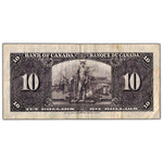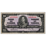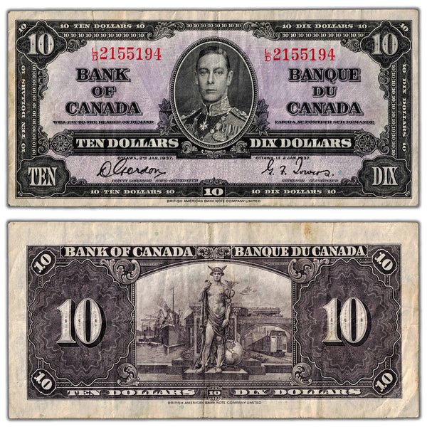 Available for sale is a $10 1937 Bank of Canada Note Gordon-Towers L/D Prefix BC-24b - F/VF