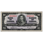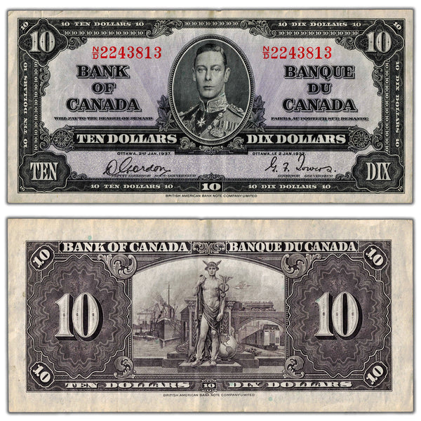 Available for sale is a $10 1937 Bank of Canada Note Gordon-Towers N/D Prefix BC-24b - VF/EF